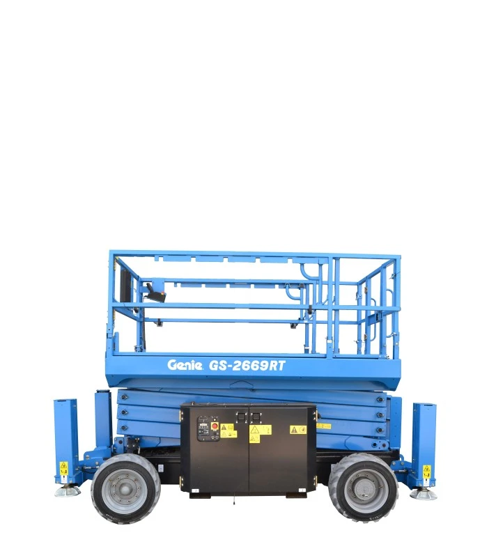 De Genie GS 2669RT 4x4 diesel schaarlift MET stabilisatoren is 175cm breed, 376cm lang en heeft een maximale werkhoogte van 9.75 meter*. Het brede platform heeft een hefvermogen van 680kg en kan bovendien nog 152cm uitgeschoven worden, waarop nog 136kg gewicht kan. Dankzij het uitschuifbare platform ontstaat een zeer ruim werkplatform met een totale lengte van 396cm. Het eigen gewicht van het toestel bedraagt 4066kg. De ruwterrein banden maken dit de ideale schaarlift voor uw werken op onverharde en ruwe ondergrond.