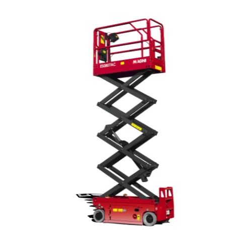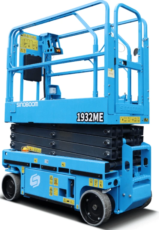 De compacte Magni ES0807AC+ elektrische schaarlift met plooibare leuningen is slechts 76cm breed en heeft een maximale werkhoogte van 7.8 meter*. Het Magni platform heeft een hefvermogen van 272kg. De compacte Sinoboom 1932ME elektrische schaarlift met plooibare leuningen is 81cm breed en heeft een maximale werkhoogte van 7.8 meter*. Het Sinoboom platform heeft een hefvermogen van 230kg. Beide types schaarliften zijn uiterst geschikt om er met 1 of 2 mensen in te werken. Bovendien kan het platform 90cm uitgeschoven worden, waarop nog 120kg gewicht kan (of 113kg bij de ES0807AC+). Het eigen gewicht van het toestel bedraagt 1575kg (1932ME) of 1630kg (ES0807AC+). De NON-marking banden maken dit de ideale schaarlift voor indoor werken en dankzij de kleine draaicrikel kan men makkelijk tussen smalle doorgangen op verharde en vlakke ondergrond. De schaarlift kan tevens buiten gebruikt worden, maar enkel op een vlakke en verharde ondergrond (asfalt/beton).